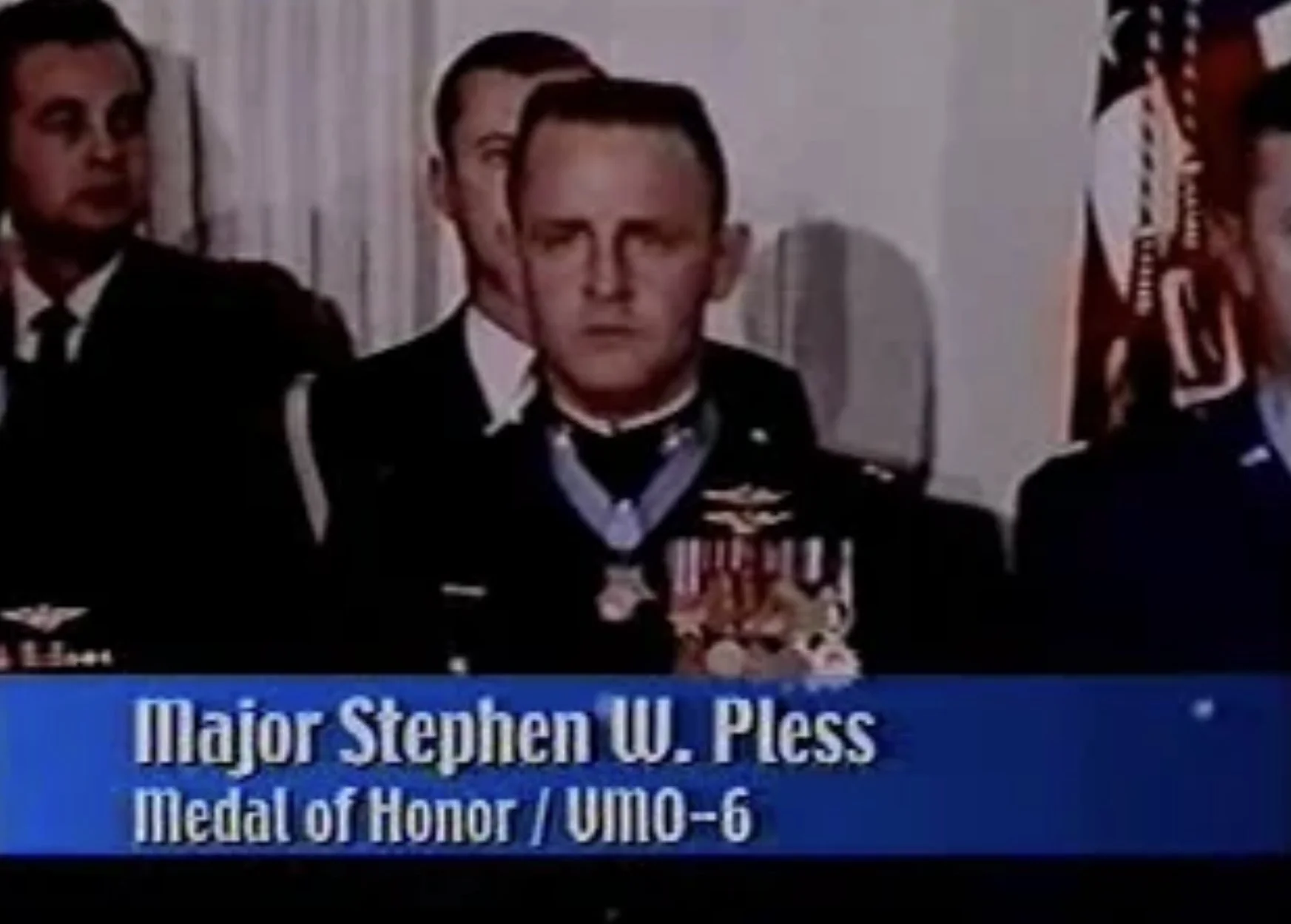 For conspicuous gallantry and intrepidity at the risk of his life above and beyond the call of duty while serving as a helicopter gunship pilot attached to Marine Observation Squadron 6 in action against enemy forces. During an escort mission Maj. Pless monitored an emergency call that 4 American soldiers stranded on a nearby beach were being overwhelmed by a large Viet Cong force. Maj. Pless flew to the scene and found 30 to 50 enemy soldiers in the open. Some of the enemy were bayoneting and beating the downed Americans. Maj. Pless displayed exceptional airmanship as he launched a devastating attack against the enemy force, killing or wounding many of the enemy and driving the remainder back into a treeline. His rocket and machinegun attacks were made at such low levels that the aircraft flew through debris created by explosions from its rockets. Seeing 1 of the wounded soldiers gesture for assistance, he maneuvered his helicopter into a position between the wounded men and the enemy, providing a shield which permitted his crew to retrieve the wounded. During the rescue the enemy directed intense fire at the helicopter and rushed the aircraft again and again, closing to within a few feet before being beaten back. When the wounded men were aboard, Maj. Pless maneuvered the helicopter out to sea. Before it became safely airborne, the overloaded aircraft settled 4 times into the water. Displaying superb airmanship, he finally got the helicopter aloft. Major Pless' extraordinary heroism coupled with his outstanding flying skill prevented the annihilation of the tiny force. His courageous actions reflect great credit upon himself and uphold the highest traditions of the Marine Corps and the U.S. Naval Service.